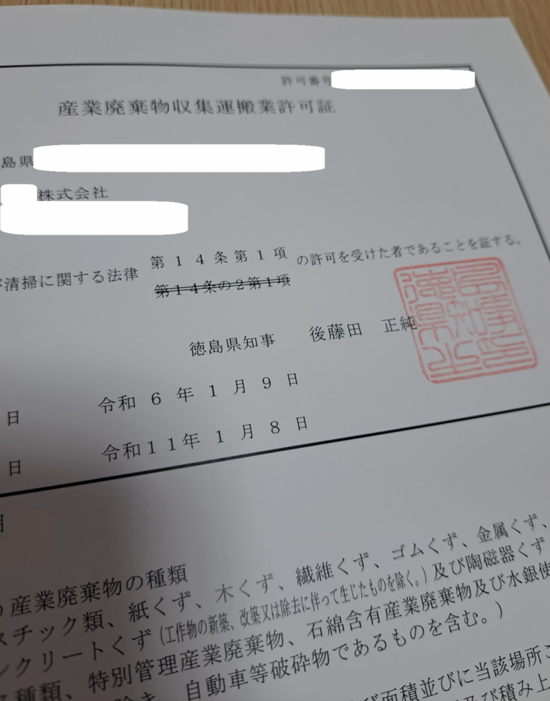 昨年暮れに徳島県に提出していた、産業廃棄物収集運搬業の許可が下りました。