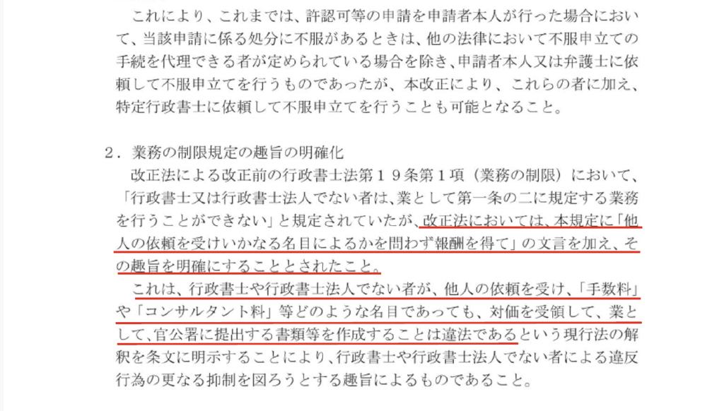 ※2026年1月1日より、明確化され、罰則が強化されるということですので、2026年1月1日までならやっていいということではありませんので、お間違いないようお願いします。現在でも、「対価を得て、業として官公署に提出する書類を作成する行為」は違法です。